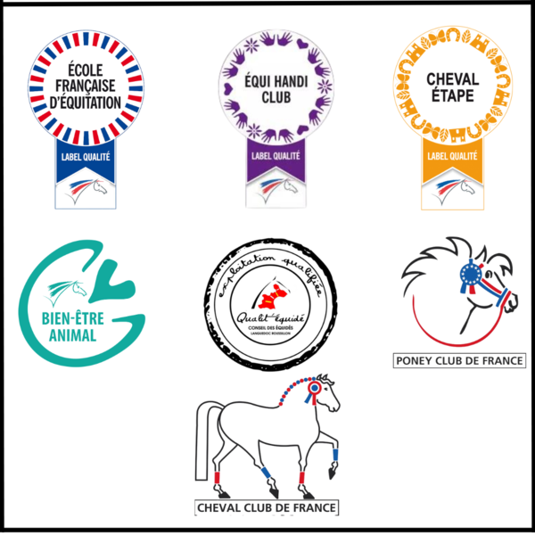 Labels : Ecole Française d'Equitation, Equi Handi club , Cheval Etape, label bien être animal